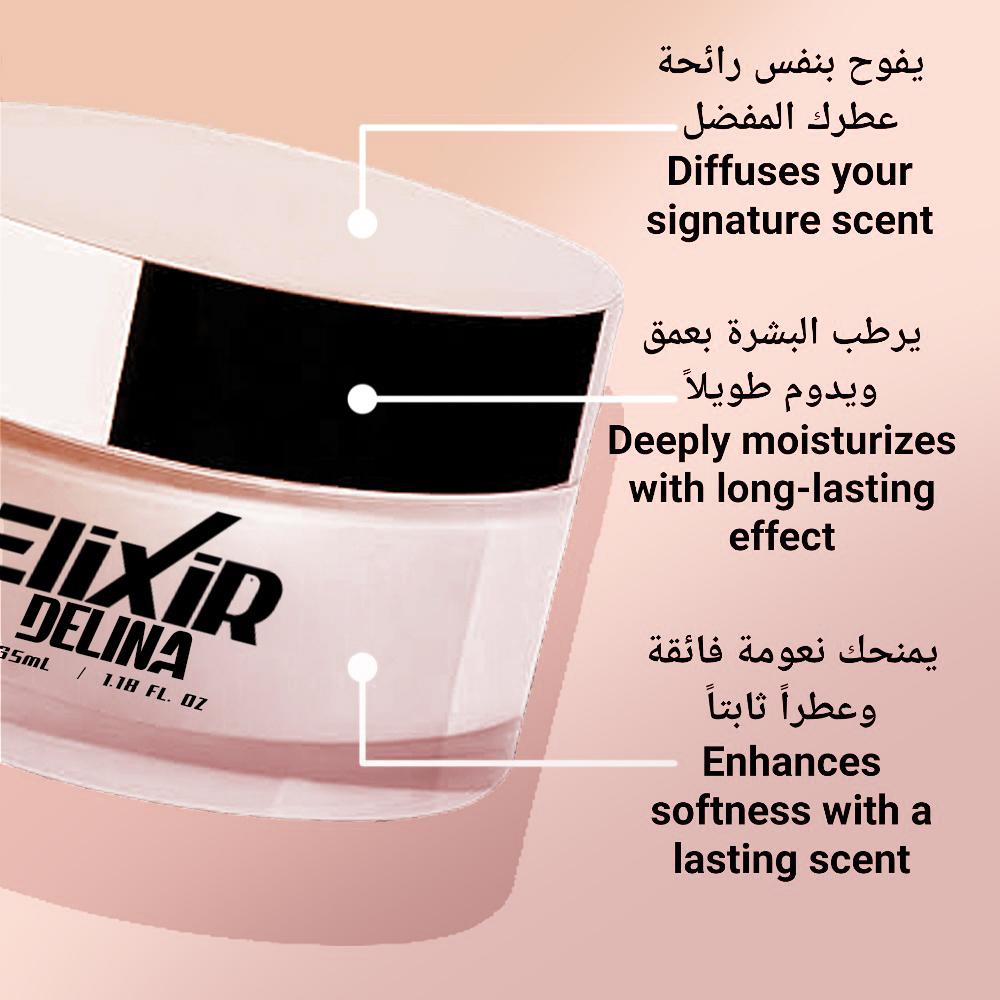 تخيّلي حديقة مخملية عند الفجر، تتلألأ قطرات الندى على بتلات الورود، بينما تعبق الأجواء بنسمات الفواكه الطازجة والتوابل الدقيقة. نسمة ناعمة تحمل عبير الزهور البيضاء والمسك، ثم تختم بلحظة هادئة تستقر فيها الروائح على مزيج دافئ من الخشب والبخور، كأنك ترتدين عباءة من النعومة والصفاء.